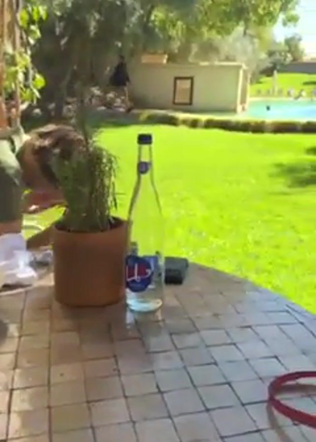 The video begins with a close-up shot of a tiled table set with a dessert in a glass dish topped with raspberries, a plate of food with a pale yellow sauce, a bottle of water, a potted rosemary plant, a cup of coffee, and a glass of water. Someone in a green shirt is out of focus in the background. The camera then pans to reveal a lush green lawn leading to a swimming pool area. People are swimming and lounging by the pool, which is surrounded by structures that look like cabanas or poolside buildings. A man walks along the edge of the pool. The sky is clear and blue, suggesting a sunny day.