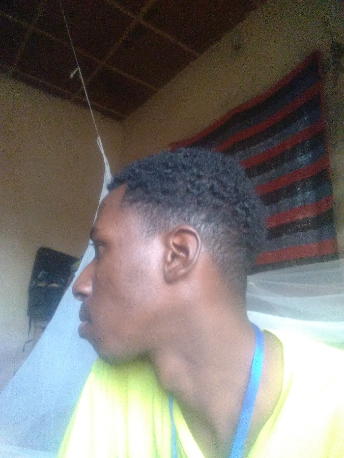 The scene takes place indoors in the city of Jos, Nigeria. A male individual, appearing to be of African descent, is positioned in profile, facing left. He has dark skin, short, curly black hair with a fade, and is wearing a yellow or lime-green shirt with a blue lanyard around his neck. His gaze is directed out of frame to the left. A white mosquito net is partially visible in the foreground, hanging on the left and extending across the lower right. The background features light brown walls. On the upper right wall, a rectangular fabric or mat with alternating horizontal stripes of dark grey/black and red/dark orange is affixed. The ceiling above consists of dark brown square panels. A thin, light-colored string hangs from the ceiling in the upper-left quadrant. A dark, indistinct object is partially visible in the blurred background on the far left.