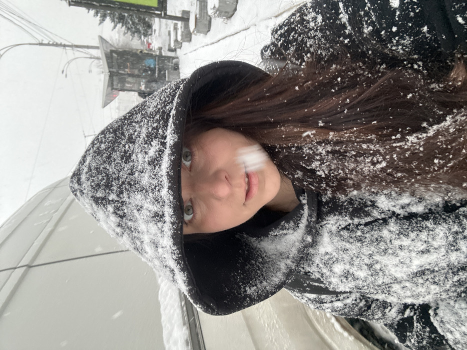 A woman with long brown hair and green eyes faces the camera in a snowy outdoor setting. She wears a black hooded jacket, and both her hair and the jacket are covered in snowflakes. The background shows a blurred cityscape with buildings and street lights obscured by the falling snow. The picture is taken from a slightly low angle, emphasizing the woman's face and the heavy snowfall.