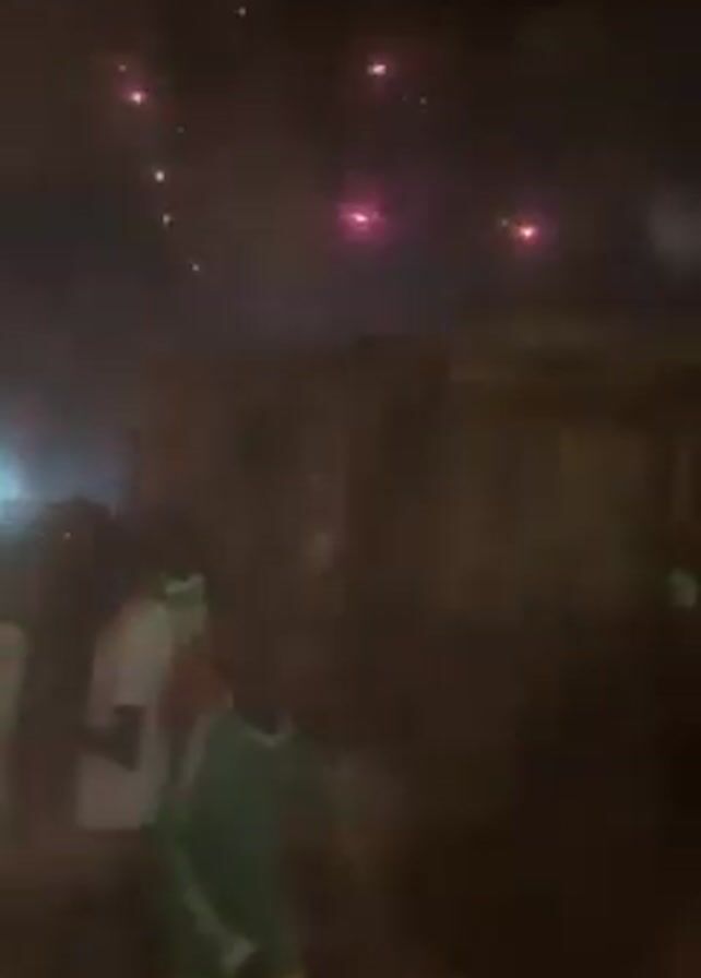 dark, chaotic scene with multiple people in the background. There are bright lights in the distance, and what appears to be smoke or haze filling the air. Several ropes dangle in the foreground. A large piece of cardboard or material is also visible. Intermittent flashes of light can be seen in the distance, accompanied by the sound of explosions. People can be heard shouting and making excited noises.
