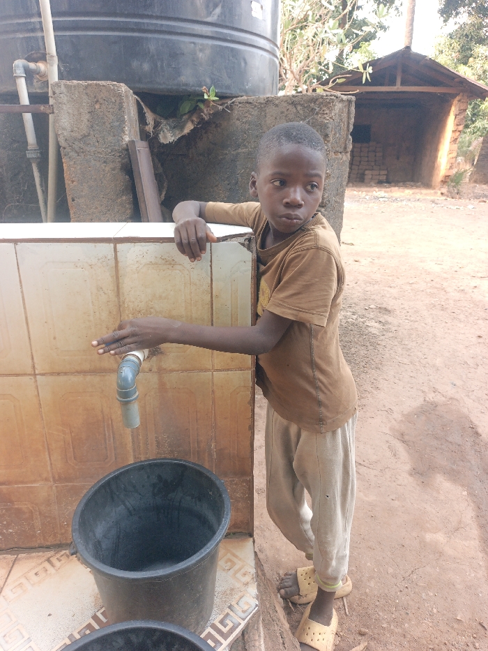 A young boy stands in Akwanga, Nigeria, beside a tiled water stand