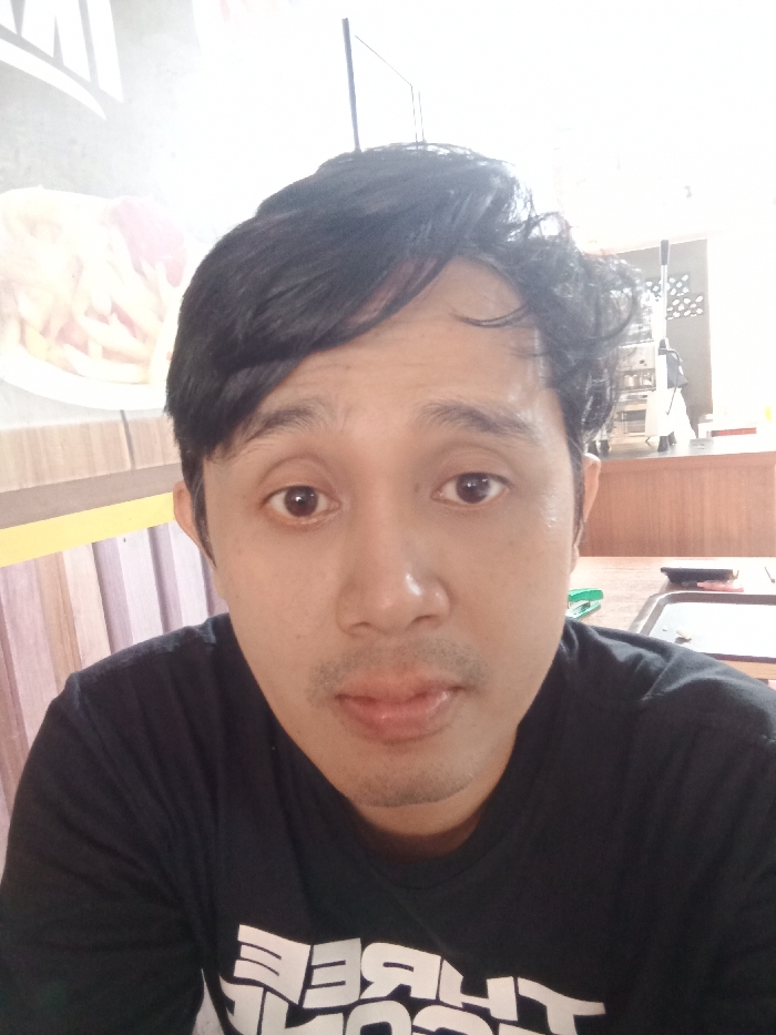 A close-up selfie captures a man with dark, slightly wavy hair and brown eyes. He wears a black t-shirt featuring white lettering. The background reveals a restaurant setting with a menu or advertisement displaying fries. A counter with kitchen appliances is also visible, hinting at the casual dining environment. The lighting is soft, creating a relaxed atmosphere.