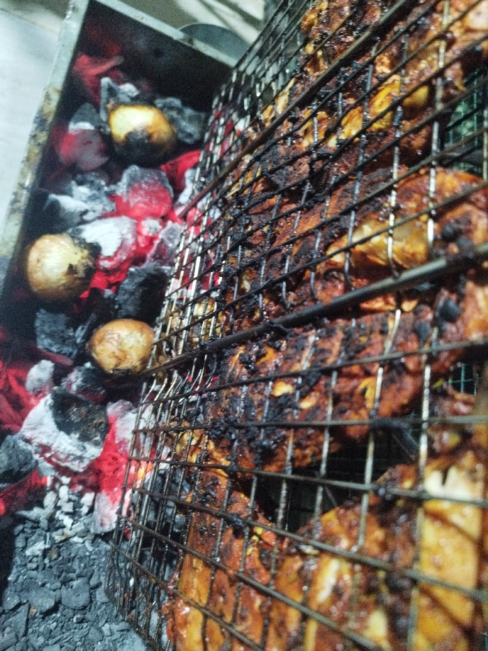 The image displays a close-up, angled view of a grilling scene in Sika, Palestinian Territory