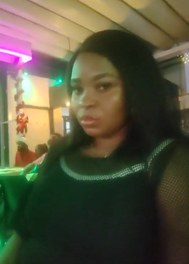 A woman with long dark hair is centered in the frame, looking directly at the camera. She wears a black top with a silver-trimmed neckline. The lighting changes color, cycling through pink, purple, and yellow. In the background, there are other people and interior elements suggesting a restaurant or bar setting. The ceiling above has a slatted design.