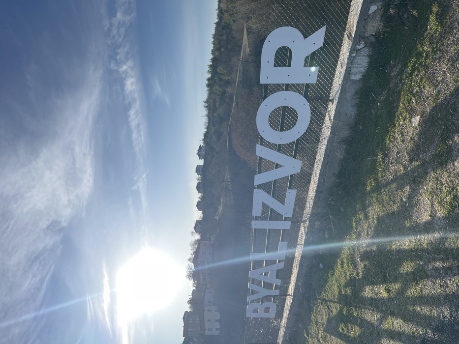 The image captures an outdoor scene in Byal Izvor, Bulgaria, under a clear blue sky with sparse, wispy white clouds