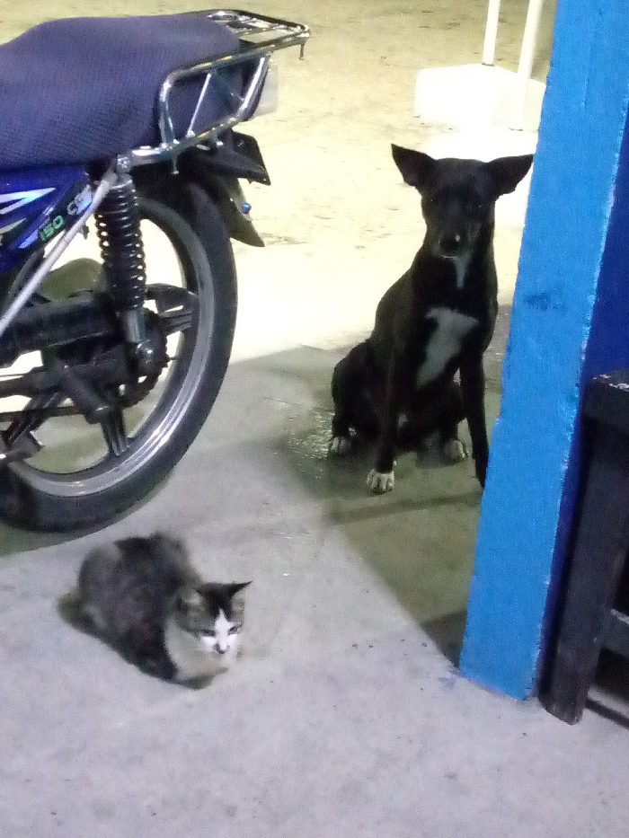 A black dog with a white chest sits near a blue post. Beside the dog is a grey and white cat in a loaf position, gazing toward the dog. A motorcycle is partially visible on the left side of the frame. The setting appears to be outdoors with light, possibly from a street lamp, illuminating the scene. The ground is a pale concrete surface.