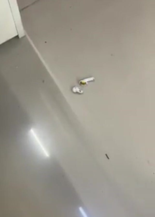 close-up of two white Apple AirPods lying on a grey floor. One of the AirPods is broken, exposing the internal components, including a gold-colored battery. The floor is well-lit, with a white baseboard visible in the background.