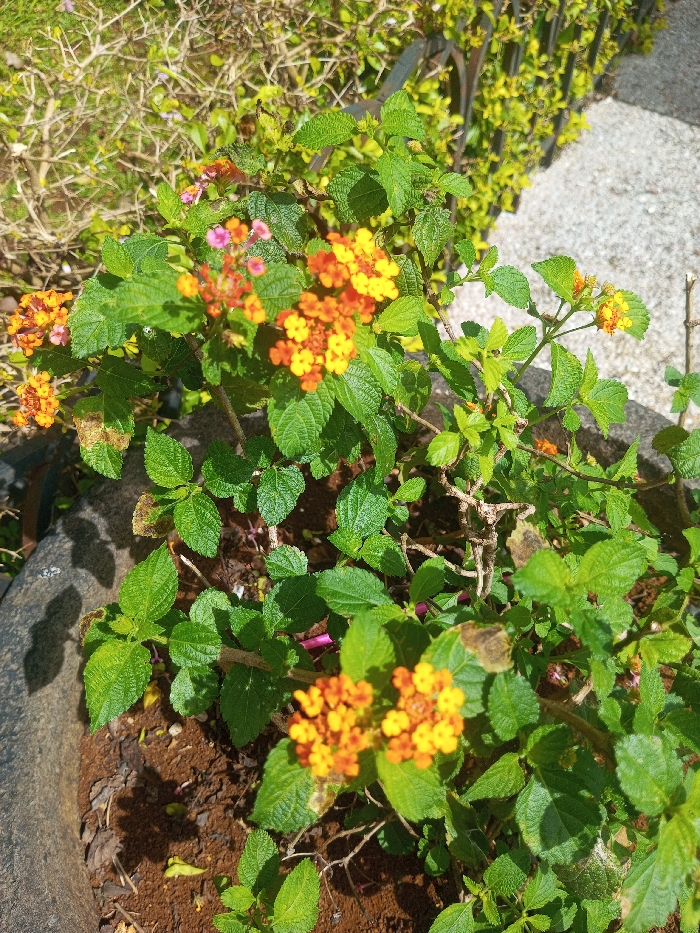- "A vibrant Lantana plant bursts with clusters of orange, yellow, and pink flowers amidst lush green leaves, filling a grey stone pot" by FM-KfPFQ2, licensed under CC BY 4.0