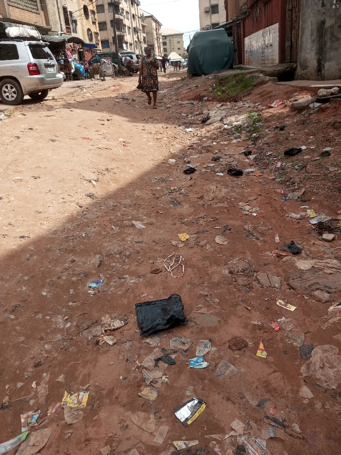 The image depicts a street scene in the city of Onitsha, Nigeria. The foreground is dominated by an unpaved, reddish-brown dirt road, heavily strewn with various forms of litter, including numerous plastic wrappers, discarded plastic bags (one prominent black bag in the immediate foreground), and general refuse. A diagonal shadow from an unseen object or structure crosses the road from the upper left to the lower right. In the mid-ground, an adult individual, likely female, walks towards the viewer on the dirt road. She is wearing a patterned, multi-colored short-sleeved dress or gown and sandals, and carries a dark bag over her left shoulder. Her gaze appears directed forward. To the left of the road, a silver SUV, identifiable as a Toyota Highlander, is parked facing away from the viewer. Behind the parked vehicle and extending further down the street, a series of multi-story residential or commercial buildings with balconies and barred windows line the road. Several informal market stalls or vendor setups with awnings are visible at the base of these structures. The right side of the road features a raised, uneven dirt bank, also littered with debris. Further along this bank, a large object covered by a dark green tarp is present. Beyond the bank, an older, reddish-brown building with concrete elements is visible. In the far background, the dirt road continues uphill, with more buildings visible on both sides and indistinct figures suggesting further human presence and activity. The sky appears overcast or hazy.
