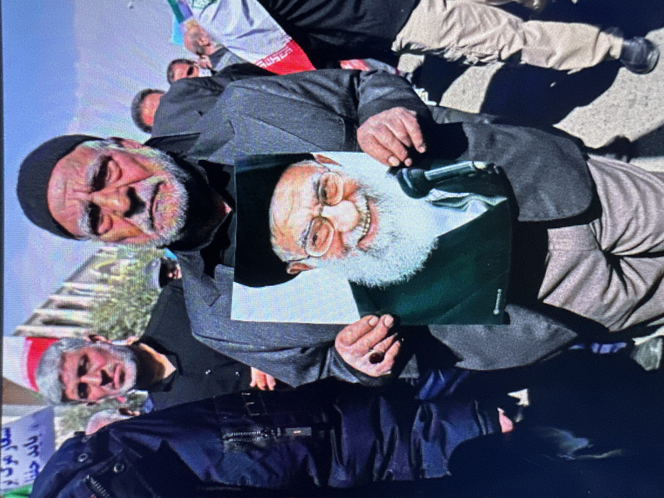 The image depicts a public gathering outdoors in Popovo, Bulgaria, during daylight hours. The central subject is an elderly man with a tanned complexion, dark eyes, a grey beard, and a mustache. He wears a black knitted cap, a black long-sleeved shirt, a dark grey blazer, and light brown trousers. A dark red ring is visible on his right ring finger. He holds a vertical, glossy photograph of Ayatollah Ali Khamenei at chest level, which shows the cleric smiling, wearing glasses, a black turban, and a dark robe, speaking into a microphone. The man's gaze is directed straight ahead with a serious expression. Behind and to the left of the central figure, a man with grey hair and beard, wearing a black shirt, is visible, looking to the left. On the far left, a person partially obscured wears a dark blue puffer jacket. To the right and behind the central figure, an individual wearing a white face mask is present. Further right, another person is seen wearing tan trousers and a scarf with colors resembling the Iranian flag. In the far background, a banner displaying white Persian/Farsi text, including "شعار مرگ بر" (Slogan: Death to...), is partially visible against light blue and red backgrounds. Distant multi-story buildings with arched architectural elements are present, set against a clear blue sky. The ground surface appears to be paved.