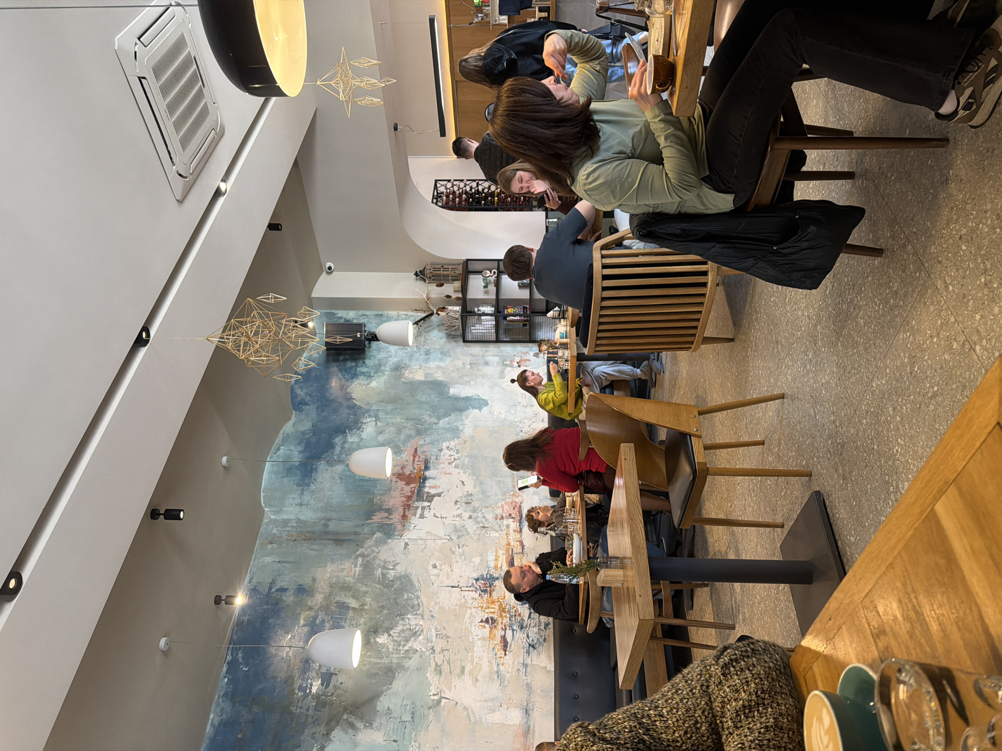 The image depicts the interior of a cafe or restaurant in what appears to be Hrodna, Belarus, judging by architectural styles and possible Cyrillic script in the background details. Several patrons are seated at wooden tables and chairs, likely engaged in conversation or eating. Some are looking at their phones or tablets. The room is illuminated by hanging pendant lamps and recessed lighting. A large mural covers a wall, featuring an abstract design with blues, whites, and browns. The interior features an air conditioning unit and decorative, geometrical sculptures.