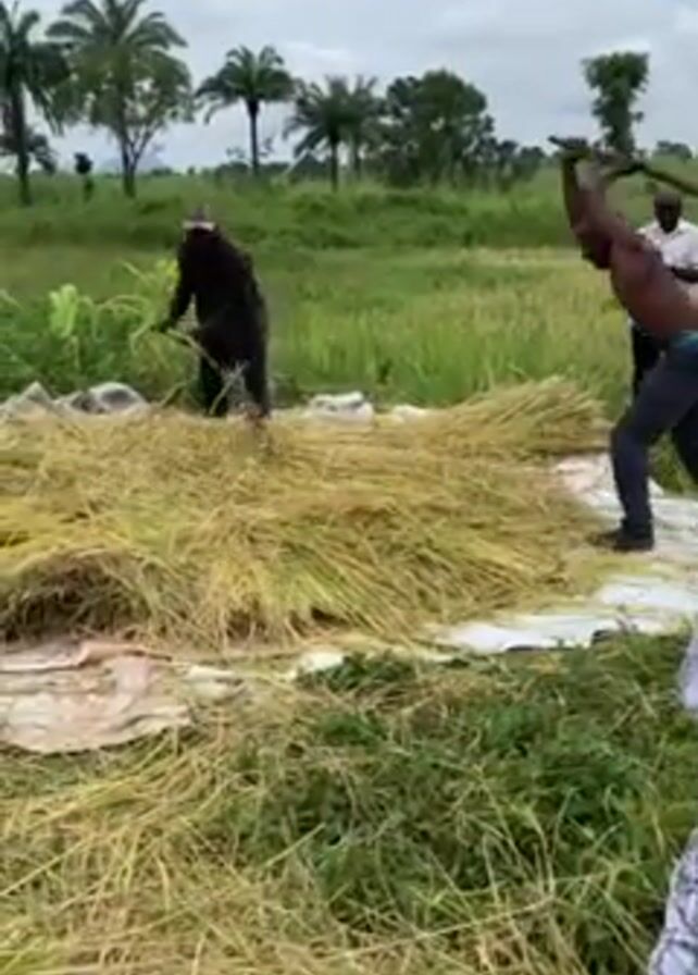 In a field of tall grass and palm trees under a cloudy sky, four men are threshing rice. One man wears a black head covering, a black long-sleeved shirt, and dark pants. Another man is shirtless and wears dark pants with blue underwear showing above the waistband. The other two men are wearing shirts and pants. The men are swinging long, curved sticks and hitting a pile of harvested rice spread out on a white tarp. Some of the men are barefoot. The camera is held by a person wearing a blue patterned shirt.