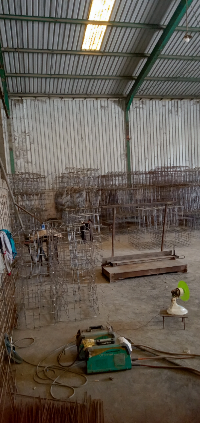 The image displays the interior of an industrial workshop or storage facility located in Sumput, Indonesia. The structure features a corrugated metal roof with translucent skylight panels, supported by green-painted metal beams. The walls are constructed from light-colored corrugated metal sheeting. The concrete floor shows signs of wear. The primary subjects are numerous pre-fabricated steel rebar cages, arranged in stacks across the concrete floor, filling a significant portion of the visible space. These cages vary in size and suggest a production or storage area for construction materials. In the foreground, a green and black "WIPRO LETARIAN" inverter welding machine is positioned on the floor, connected by cables to an attached welding clamp or electrode holder. Nearby, bundles of thin metal rods are visible on the floor. In the mid-ground, a white vintage-style table fan with a translucent green blade guard rests on a small, dark wooden stool. Towards the left, two rudimentary workbenches or tables are situated among the rebar stacks; one appears to hold a blue container. Further right, a low, dark wooden platform or pallet is present on the floor. White and blue fabric, possibly clothing, hangs on a metal structure on the far left. No individuals are visible within the scene.