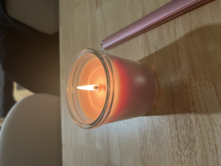 A lit candle in a clear glass jar, containing orange-colored wax, sits on a light-toned wooden surface. The candle's bright yellow-white flame is actively burning, illuminating the immediate area. To the right of the candle, a slender, metallic pink object, possibly an electronic lighter or a similar device, rests on the same wooden surface. The background is out of focus, showing indistinct light and dark shapes that suggest an indoor setting. No specific identifying markers are present to determine a precise location within New York City, United States. There are no people visible.