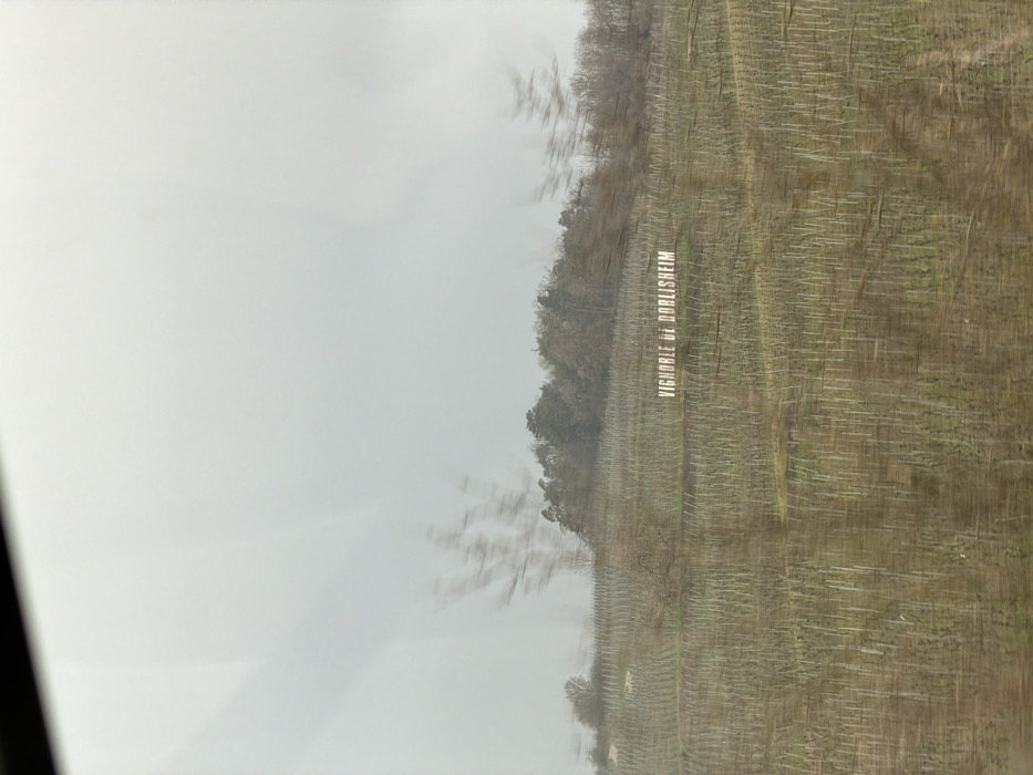 The image displays an outdoor scene, likely a rural or semi-rural landscape, viewed through a surface exhibiting motion blur and reflections. The central subject is a vineyard, identified by large white capital letters within the field spelling "VIGNOBLE DE DORLISHEIM." This indicates the scene depicts a vineyard in or near Dorlisheim, a commune located in Alsace, France. The grapevines appear dormant or recently pruned, arranged in distinct, parallel rows ascending a gentle slope across the mid-ground. The vines are largely bare, revealing their woody structures against muted green and brown ground. A dense line of deciduous trees, mostly without foliage, forms a horizontal band separating the vineyard from the sky in the background. The sky occupies the upper portion of the frame and is uniformly light grey and overcast. No individuals or animals are visible. The top edge of the image shows a dark, angled line, consistent with a vehicle's interior or window frame. Horizontal streaking and faint reflections across the image suggest it was captured from a moving vantage point, possibly through a window. The overall environment appears cool, possibly late winter or early spring, under diffuse light conditions.