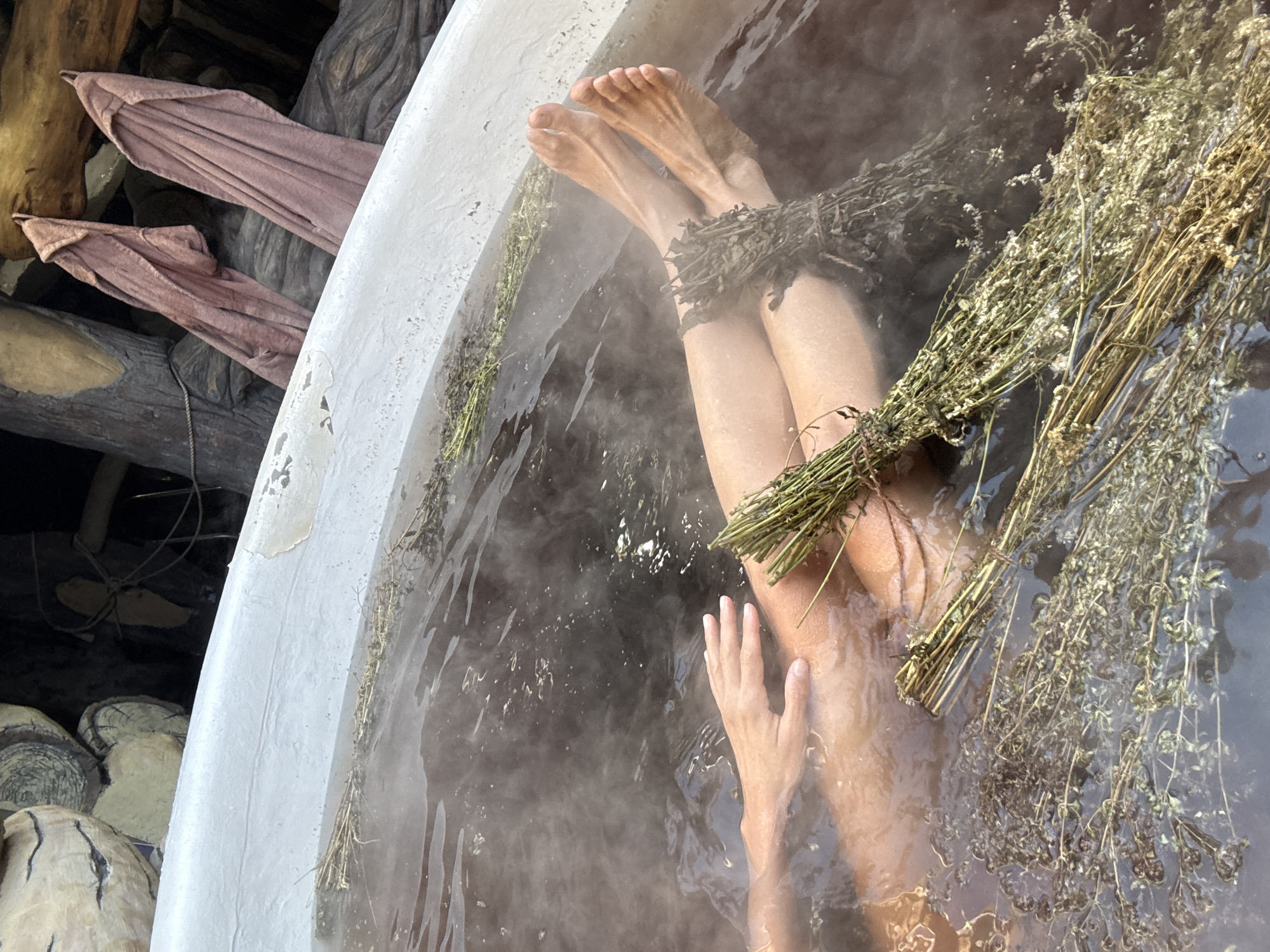 In Bely Klyuch, Russia, a person is observed from an elevated perspective, submerged in a large, light-colored tub filled with dark, steaming water. The individual's bare legs, including feet and shins, are visible, along with one arm and hand resting on the upper thigh. Multiple bundles of dried herbaceous material are present in the water; a large bundle rests across the person's lower legs, another smaller bundle is near the upper thigh, and loose strands of similar plant matter float throughout the water. The tub's rim shows signs of surface wear. The background consists of a rustic structure of stacked, rough-hewn wooden logs and beams, from which two folded, reddish-brown towels hang. A dark rope is also visible among the wooden elements.