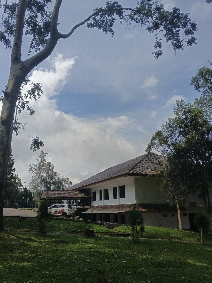 A single-story building with a dark tiled roof and white exterior walls sits on a grassy lawn under a partly cloudy sky. Several rectangular windows line the building's side. A covered walkway is attached to the building. Cars are parked beyond this walkway. Trees frame the structure on both sides, with one prominent tree in the foreground. The sky shows patches of blue amidst the clouds.