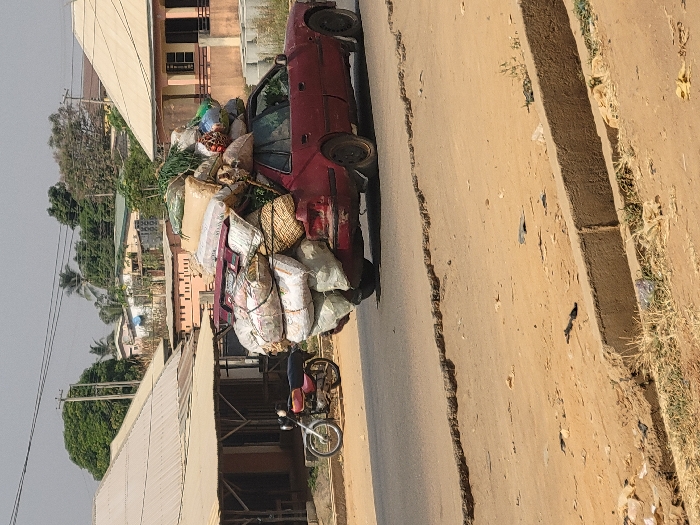 A maroon four-door sedan, heavily overloaded with cargo, travels from right to left on a paved road in Kwamba, Nigeria