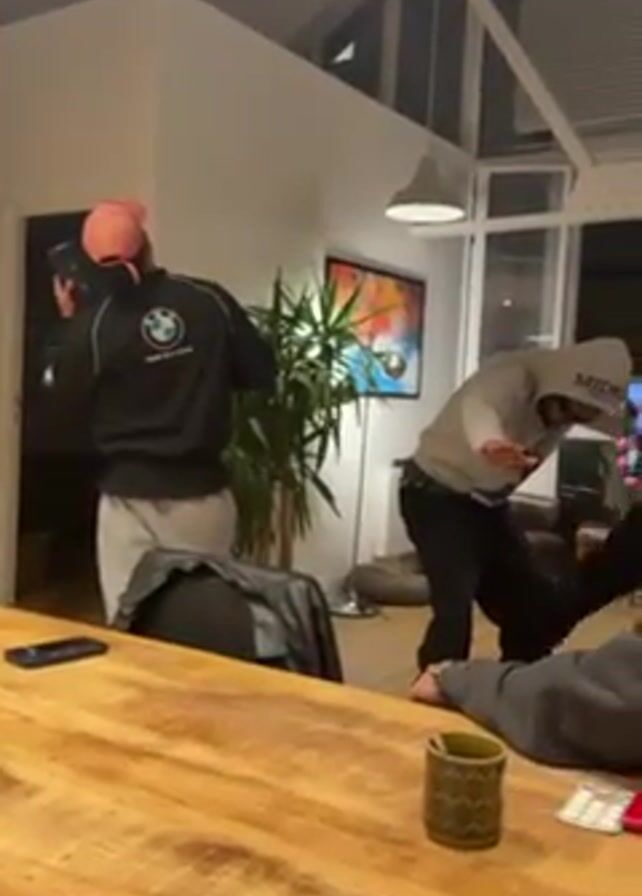 Several young men are indoors. One in a pink baseball cap, a black BMW-branded jacket and light-colored pants dances facing into a doorway. Another man wearing a hoodie and sunglasses dances near him. A third man sits at a wooden table looking at his phone. A forth man briefly appears in the background. There is a plant, a piece of artwork, and some windows in the background. There is a cup and some other items on the table.