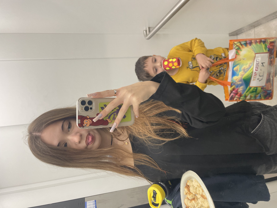 An adult female is depicted in the foreground, capturing a mirror selfie indoors, while a young male child stands behind her. The female, with long light-brown hair, a nose piercing, and dark eye makeup, wears a black long-sleeved top, dark pants, a black choker, and a gold pendant. She smiles playfully, sticking her tongue out. Her left hand, featuring long manicured nails and a silver ring, holds an iPhone in a clear case adorned with a "Curious George" character. Her right arm, partially visible, supports a white paper plate containing small, light-colored food items and a black water bottle with a yellow cap. The child, with short brown hair, wears a yellow long-sleeved shirt with a character graphic. He holds a red paper cup with yellow polka dots to his mouth and clutches a colorful reusable shopping bag with "Your Own" text in both English and Hebrew. The background consists of plain white walls, with a silver metal handrail visible on the right, suggesting a stairwell or ramp. A sign or fixture with blue elements is partially visible on the left wall. The floor is light-colored. The presence of Hebrew text on the bag indicates the location is in Israel. While specified as Raanana, the specific building or precise location within the city is not discernible from the image, beyond being an indoor public or commercial space.