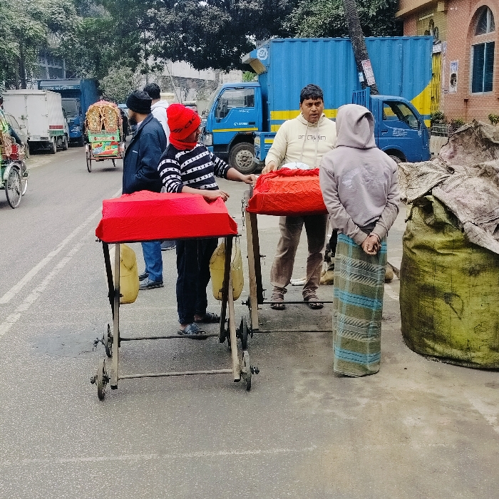 Three individuals stand near two wheeled tables, both with red coverings. One person wears a red hat and a black and white striped shirt. Another wears a hooded sweatshirt and a long, striped garment covering their legs. The third wears a light-colored sweatshirt. A blue truck is parked nearby. Additional vehicles and buildings are visible in the background. Large bags or sacks stand to the right of the group. They appear to be on the side of a road.