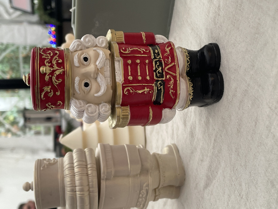 The scene depicts two decorative figurines displayed on a light-colored, textured fabric surface, likely a tablecloth, within an indoor retail or market environment in Tel-Aviv, Israel. In the foreground and center-right is a detailed nutcracker-style figurine, approximately 18-20 cm tall, painted predominantly in red, white, gold, and black. It wears a red military-style jacket with gold ornamentation, white trim, and black accents, including a black belt with a gold buckle. Its face is cream-colored with a white mustache, white hair on the sides, black eyes, and visible white teeth. A red hat with gold trim and a small gold finial sits atop its head. It stands on black boots. To the left and slightly behind the red figurine is a partially obscured, cream-colored nutcracker-style figurine. This figure appears monochromatic and less detailed than its red counterpart, with a similar shape but lacking painted features beyond its uniform silhouette. It is slightly out of focus. In the blurred background, several conical, cream-colored objects resembling small Christmas trees are visible, likely decorative candles or ornaments. Further back, multicolored fairy lights are present, indicating a festive or holiday theme. A blurred human head is faintly visible in the far left background. The overall lighting suggests an indoor setting with ambient light.