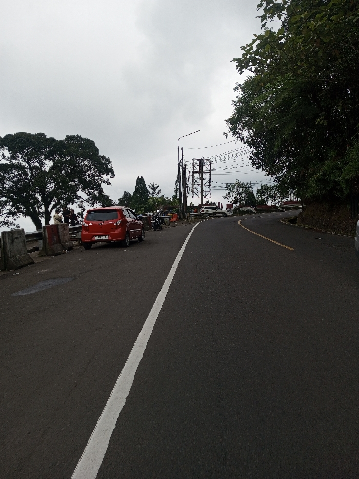 This image depicts an outdoor scene on an overcast day, identified as Gubbisamamidi, India. The primary subject is a paved asphalt road, extending from the foreground and curving right into the distance. A solid white line delineates the left edge of the main thoroughfare, transitioning into a double yellow line further along the curve. On the left side of the road, there is a paved shoulder or pull-off area. A red 5-door hatchback, bearing the Indonesian license plate "DK 1863 LY", is parked facing away from the camera, partially obscured by grey concrete road barriers. Two motorcycles are parked beyond the red car on the shoulder. Three individuals are visible standing behind the concrete barriers near the red car, facing left, seemingly overlooking a distant view. A large, mature tree with a dense canopy is prominently situated behind these individuals and barriers on the far left. Further along the right side of the road, a tall utility tower with multiple cross-arms and overhead lines is visible. Green foliage, comprising trees and bushes, lines both sides of the road, becoming denser on the rising terrain to the right. A street light pole is present on the left side, closer to the camera than the utility tower. The sky is uniformly grey and overcast.