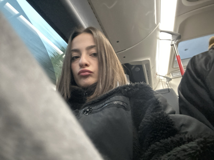 The image displays the interior of a public transport vehicle, likely a bus or tram, situated in Souffelweyersheim, France. A young female, positioned centrally and in the foreground, looks directly at the camera with her lips pursed. She has shoulder-length brown hair and is wearing a black jacket with a dark faux fur collar and a visible zipper pocket on the left chest area. To her right, partially visible, is the back of another individual's head, likely with light brown hair, and the top of a dark jacket, indicating another passenger seated ahead or adjacent. The vehicle's interior features light-colored ceiling panels, active overhead strip lighting, and multiple windows along the left side through which blurred green foliage and a light sky are visible, suggesting the vehicle is in motion. A silver grab pole with a red section is present on the right, extending from the ceiling, alongside dark grey grab handles and a visible dark seatback.