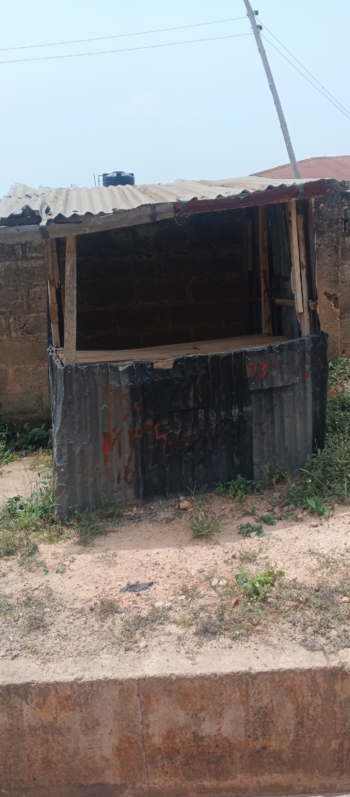 The image captures an unoccupied, open-fronted roadside stall or kiosk in Ado-Ekiti, Nigeria. The structure's lower exterior is composed of dark, weathered corrugated metal sheeting, exhibiting dents, creases, and sporadic reddish-orange paint marks. The upper frame is constructed from rough wooden planks, supporting a rusted and worn corrugated metal roof. An empty wooden shelf or counter is visible within the stall's interior. The background immediately behind the stall features a cinder block wall. The ground in the foreground consists of dry, light brown soil mixed with small stones and sparse green vegetation. A weathered concrete curb runs across the bottom of the frame. In the distant background, under a pale sky, a utility pole with power lines is visible, along with a partial view of another building's reddish-brown corrugated roof and a black water storage tank situated on a separate rooftop. No individuals, merchandise, or vehicles are present in the scene.