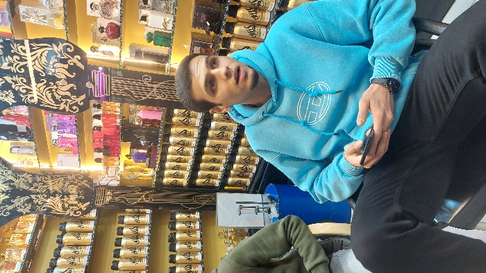 A man wearing a light blue hoodie and dark pants is sitting in what appears to be a store. Rows of gold-labeled products line the shelves in the background, some topped with black caps. Other shelves showcase various perfume bottles and decorative items. The man is looking slightly up and to the left, and holds a phone in his hands. A glimpse of another person wearing a green shirt can be seen in the lower part of the frame.
