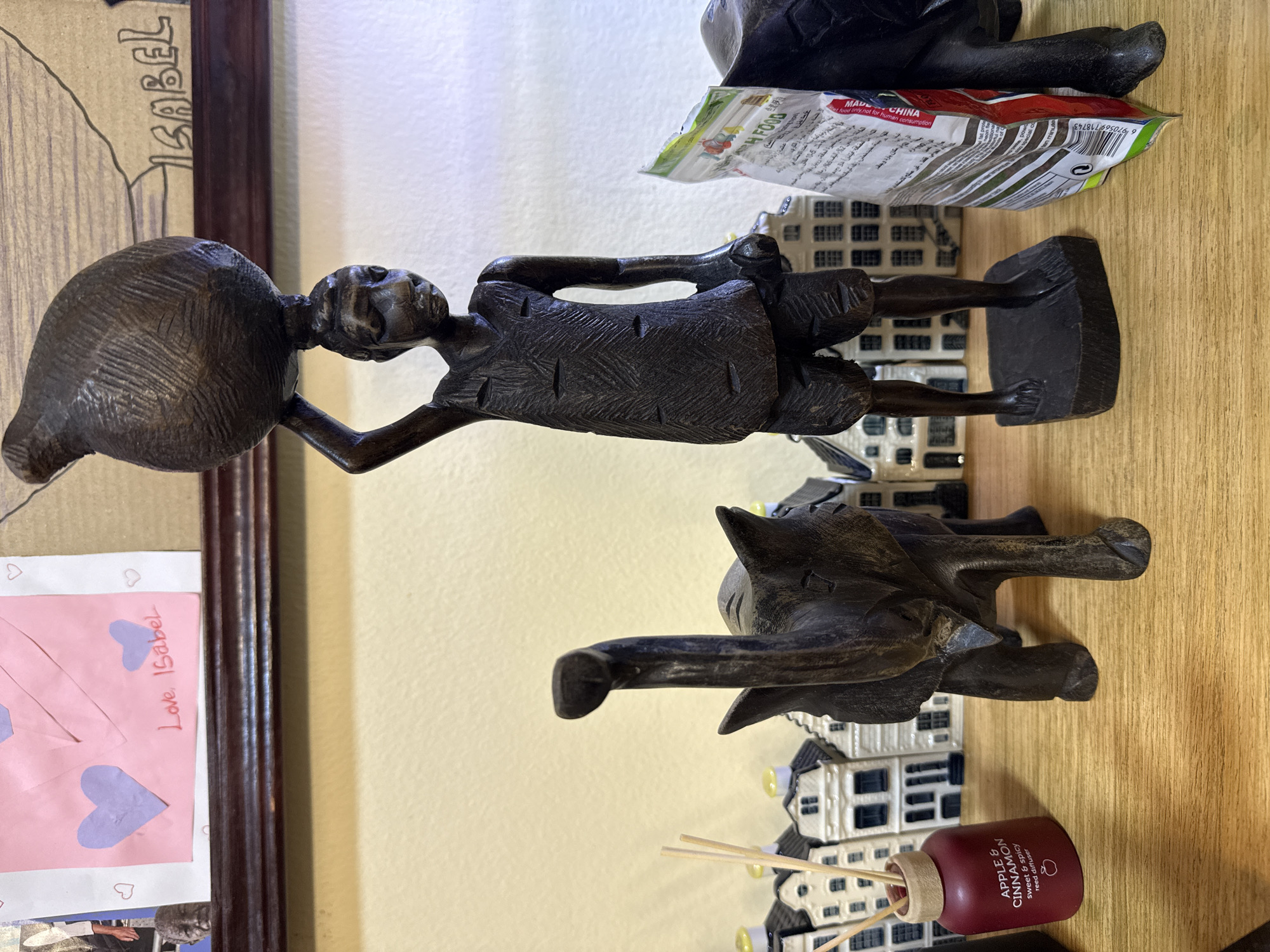 This scene, observed within the city of Alaguntan, Nigeria, depicts a collection of decorative and functional items arranged on a light-colored wooden shelf against a cream-colored wall. Centrally, a dark, carved wooden figurine of a person stands on a rectangular base, balancing a large, textured, spherical object on its head, with both arms raised to support it. The figure wears a patterned tunic and shorts. To the left of this central figure, another dark, carved wooden figurine of an elephant stands with its trunk raised. Further left, a dark red reed diffuser bottle, labeled "APPLE & CINNAMON sweet & spicy reed diffuser," contains several light-colored reeds. Behind these items, a row of white and dark-roofed miniature buildings, resembling Dutch canal houses with some yellow roof accents, extends across the shelf. To the right of the central human figure, a partially visible white and green package, marked "FRESH FOOD" and "MADE IN CHINA" with a barcode, stands upright. A portion of a second dark wooden elephant figurine is visible on the far right. Above the shelf, a dark brown wooden frame partially covers a pink paper display adorned with purple hearts and the handwritten text "Love, Isabel." Additional framed items are partially visible on either side of the pink display.