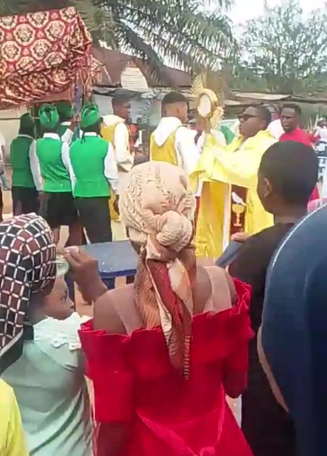 n outdoor event with a crowd of people. Some are wearing uniforms: green vests and black skirts, or white robes with yellow vests. One person wears a bright yellow robe and sunglasses, and holds a golden object. There are several palm trees, a covered structure, and a blue plastic table visible in the background. People are standing, and the camera moves around the crowd. The video is recorded with an AWEAOME A50 smartphone.