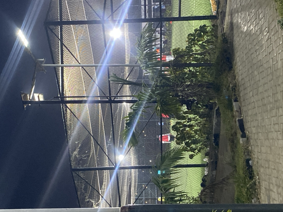 A nighttime scene of a sports field covered by a net structure supported by metal beams. Bright lights illuminate the area from above and on a pole to the left. A row of green plants lines the edge of the field, and a paved pathway is visible on the right. The net is taut and clean, with some players in red shirts visible on the green field beyond the net.