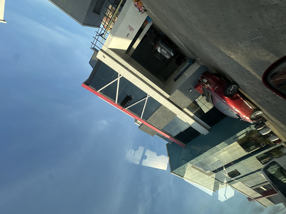 This is an outdoor, low-angle, tilted photograph of a commercial or office complex in the city of Jos, Nigeria, captured from inside a vehicle. The sky is clear blue with faint cirrus clouds in the upper half. The primary structure is a modern, multi-story building featuring dark grey walls, extensive dark-tinted glass windows with white framing, and a prominent red architectural band along its upper perimeter. The ground level includes a recessed bay where a silver sedan is parked. A white sign with red text, 'NO SMOKING,' is affixed to the exterior wall next to this bay. To the left of the primary structure, a second modern building is partially visible, distinguished by its teal-colored glass facade. A dark red sedan with silver-rimmed wheels is parked on the concrete forecourt between the viewer and the buildings. Along the base of the teal building, several white cylindrical planters are arranged. Reflections, consistent with a vehicle's windshield, are visible across the upper left portion of the image, and a partial view of a vehicle's side mirror is present in the lower right. No individuals are visible.