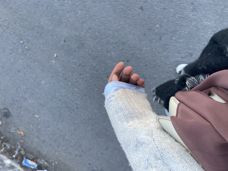An overhead view captures the lower body and left arm of an individual walking on an asphalt surface in Monastir, Tunisia. The subject's left arm is visible, clad in a light-colored, possibly off-white, cable-knit sweater with a light blue long-sleeved garment underneath. The bare left hand is partially visible, fingers slightly curled. A brown fabric bag with light-colored trim is positioned on the subject's left side. Dark pants or a skirt with a textured fringe and white shoes are visible below the bag. The grey asphalt ground contains scattered debris, including a blue and yellow plastic wrapper and a cigarette butt, primarily in the upper-left quadrant of the frame.