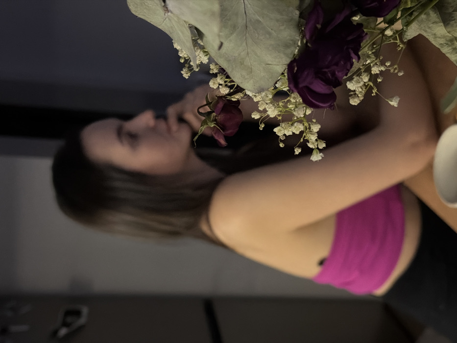 A woman with long brown hair and a pink top sits near a floral arrangement. The arrangement features green leaves, small white flowers, and purple roses. She rests her hand near her face as she looks off into the distance. A white cup is also visible.