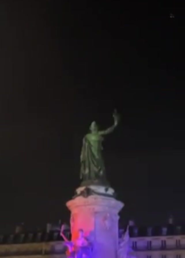At night, a bronze statue stands atop a multi-tiered, white stone base. The statue depicts a person draped in cloth, with one arm raised. The base is illuminated by red and blue lights. In the background, blurry buildings are visible. A cyclist is seen at the bottom left of the screen.