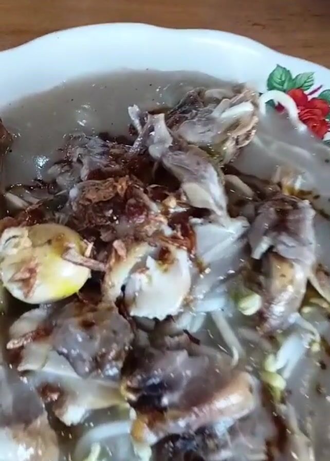 A partially eaten plate of what appears to be Soto Ayam, an Indonesian chicken soup, is shown in the video