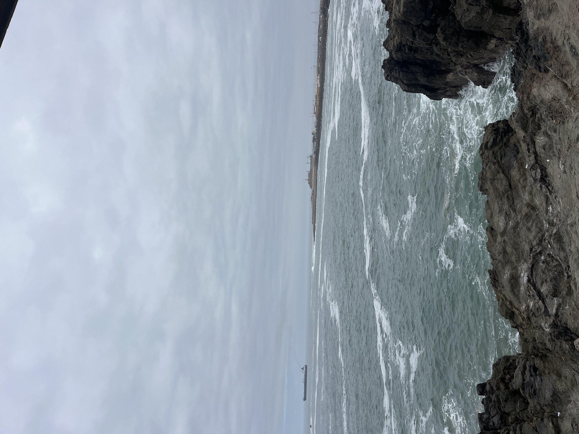 The image depicts a coastal scene in Arica, Chile, observed from a rocky vantage point overlooking the Pacific Ocean and the city's port. The foreground reveals dark, rugged volcanic rock formations on a cliff edge, with turbulent, teal-green ocean water crashing against them, creating white foam. The midground features a wide expanse of the Pacific Ocean, characterized by numerous whitecaps and frothy wave patterns. Approximately one-third from the left edge of the frame, a dark, large-hulled cargo ship or tanker is visible on the water, with a smaller, lighter-colored vessel positioned to its immediate left. In the background, a long, dark breakwater or jetty extends from the right side of the frame towards the left, partially enclosing the Port of Arica. A red and white lighthouse is situated on a small, elevated landmass at the far end of the breakwater, with various industrial port structures, including cranes and buildings, visible behind it along the coastline. The sky above is uniformly overcast and grey, indicative of cloudy daytime conditions. No individuals are present in the observable scene.
