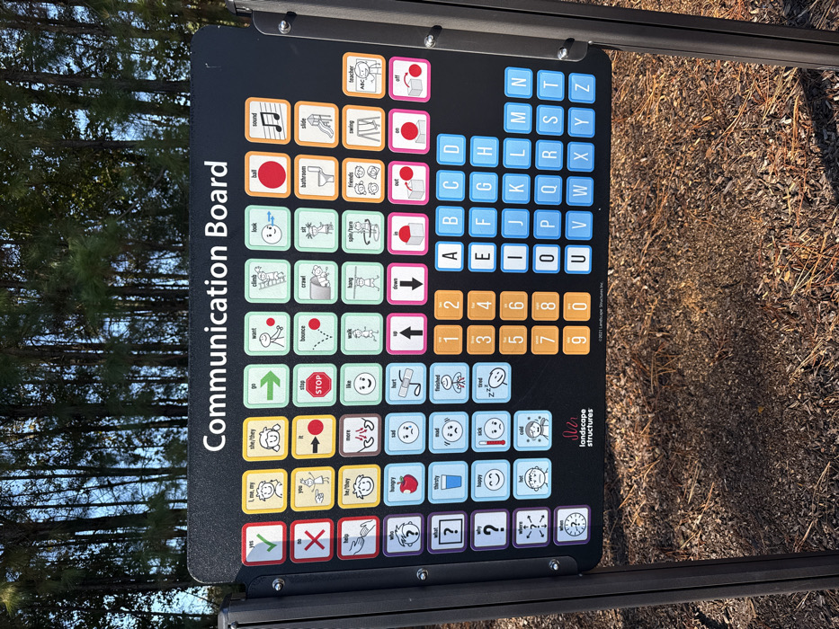 A black communication board, featuring a grid of colorful pictogram-based buttons, stands outdoors on dark metal posts
