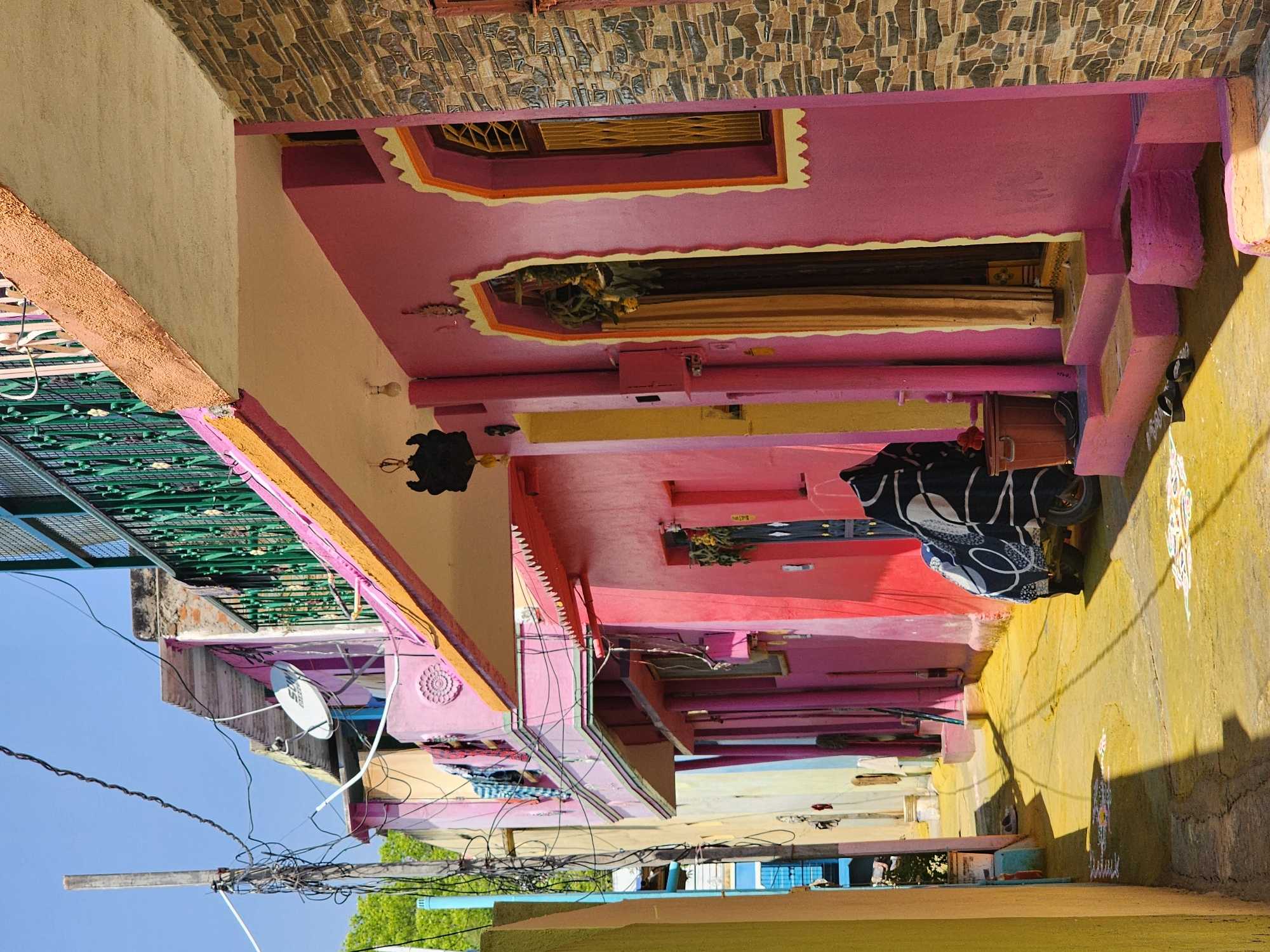 The image depicts a sunlit, narrow residential alleyway in Pedda Kammavaripalli, India. The ground of the alley is extensively coated with a bright yellow substance, likely turmeric, interspersed with white decorative patterns. On the right, a prominently featured two-story building is painted a vibrant magenta pink. Its ground floor features an arched entryway with a beige curtain and a dark hanging lantern above it. Adjacent to the entrance is an arched window with a yellow and white scalloped frame, containing a decorative lattice and a light brown shutter. To the far right, the building wall is faced with multi-toned rectangular tiles. A scooter, covered with a black and white patterned fabric, is parked on the yellow ground near the entrance. Pink steps lead up to the entrance, where a brown plastic bin with red handles and dark sandals are visible. Along the left side of the alley, buildings exhibit various colors including yellow, light blue, and pink. A tall wooden pole entangled with numerous black electrical wires stands vertically on the left. Higher up, a pink building features a balcony with a green ornate metal railing, below which a white "SUN Direct" satellite dish is affixed. Laundry, including brightly colored fabrics, is hanging to dry from an upper balcony or railing on a pink building. Overhead, multiple power lines crisscross against a clear blue sky. The alley is devoid of people or active interactions, characterized by bright sunlight and pronounced shadows.
