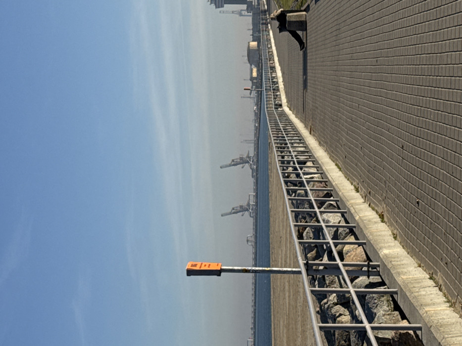 The image depicts a waterfront promenade in Gdańsk, Poland, likely located on the Westerplatte peninsula or a nearby area, providing a view across the water towards the industrial Port of Gdańsk. In the foreground, a paved pedestrian walkway constructed of light grey rectangular pavers extends from the lower right towards the center-midground. To its left, a silver metal railing runs parallel to the walkway, separating it from a riprap of large, irregularly shaped rocks forming a shoreline barrier. Beyond the rocks is a narrow strip of sandy-brown ground and then the blue water body. A tall, thin metal pole with an orange box-like signaling device or utility box is positioned in the left foreground, just behind the railing. In the midground, across the water, a significant industrial port landscape is visible. Two prominent, tall gantry cranes, likely used for container handling, stand against the horizon. Other smaller industrial structures and buildings are discernible along the distant shoreline. The background features a clear, light blue sky with a slight atmospheric haze near the horizon. To the far right, a tall, slender structure resembling a port control tower with a distinctive cap is visible, alongside additional industrial infrastructure including storage tanks. One individual is present on the paved walkway in the right midground, seated on a concrete block or bench, facing away from the camera and towards the water and port. The scene is illuminated by bright daylight, casting distinct shadows from the railing onto the rocks and walkway.