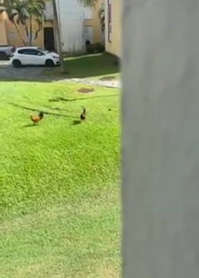 two roosters walking on a grassy lawn in an outdoor area. The lawn is surrounded by buildings, palm trees, and parked cars. The camera moves slightly during the recording.