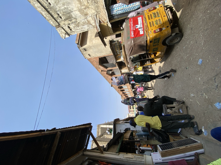The image depicts a bustling street scene in Sabon Gari East, Nigeria, under a clear blue sky