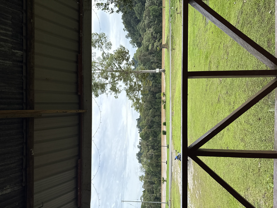 A landscape seen from under a roof, partly obscured by wooden beams on the right. Beyond, a grassy field meets a line of trees. A narrow path runs between the field and the woods. In the center, a tall tree stands alone, framed by the eaves and the field. The sky is overcast with pale clouds. A person can be seen down on the path wearing blue.
