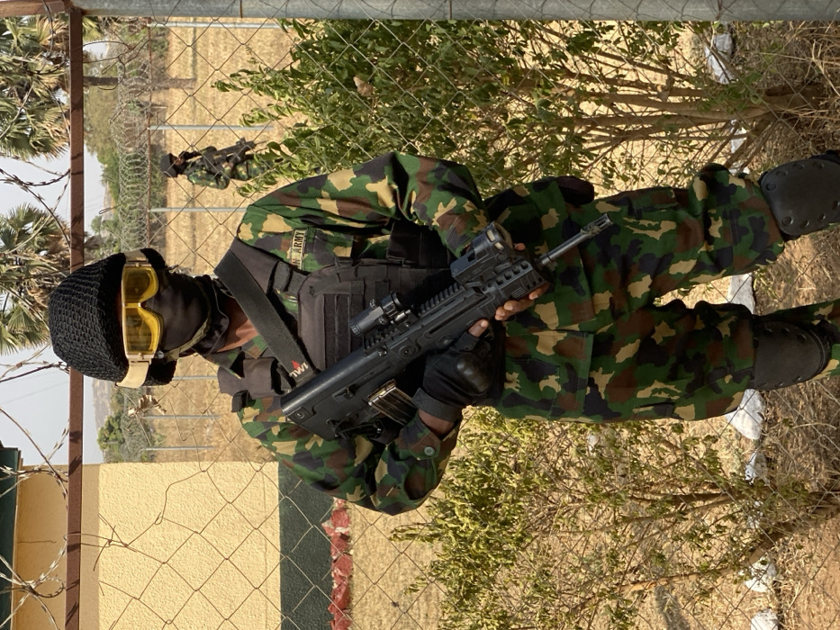 An armed Nigerian Army soldier stands in the foreground of an outdoor scene in Kachia, Nigeria