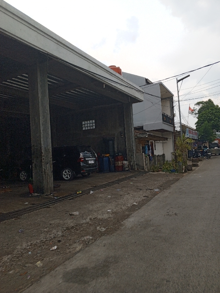 The image depicts an urban street scene. Visual evidence, specifically the "B 2589 POZ" license plate format on a vehicle and the red and white horizontally striped flag, indicates the location is in Indonesia, not Kheda, India. In the foreground and midground left, a concrete structure, likely a workshop or garage, features a broad, flat roof supported by two visible concrete pillars. The interior of this open-front structure is dark, but a black SUV (possibly a Toyota Avanza) is parked facing away from the viewer, displaying a "B 2589 POZ" license plate. To the right of the SUV, several blue and red industrial drums or barrels are stacked. A small rectangular glass block window is visible high on the rear wall of the structure. A red fire extinguisher is partially visible on the far left. The ground within and immediately outside this structure is concrete, appearing dirty with scattered debris and two parallel metal channels embedded in the pavement. Adjacent to the workshop on the right, a two-story building with a light gray facade is visible. An orange water tank sits on its roof, and a second-story balcony with black railings protrudes from its front. An entrance is present on the ground floor. A street light pole with an apparent solar panel is positioned on the sidewalk in front of this building. Further down the street, beyond this building, a smaller structure with a blue sign (text illegible) can be seen. Several motorcycles are parked along the right side of the street in front of this smaller building. A red and white horizontally striped flag, consistent with the flag of Indonesia, flies from a pole further in the background, partially obscured by green foliage. The sky is overcast with light gray cloud cover. No individuals are visible in the scene.