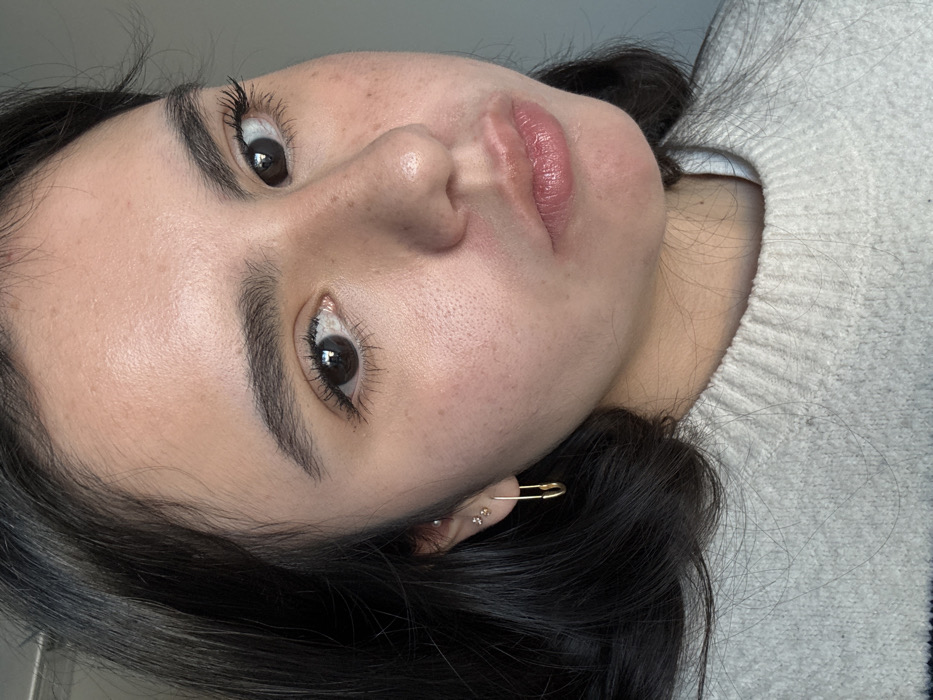 A woman's face is the focal point of the shot. She has dark hair, brown eyes, and freckles. Her eyebrows are thick and well-defined. She wears a light pink lip gloss. The woman is wearing a light-colored sweater with a ribbed collar. A large gold safety pin is used as an earring.