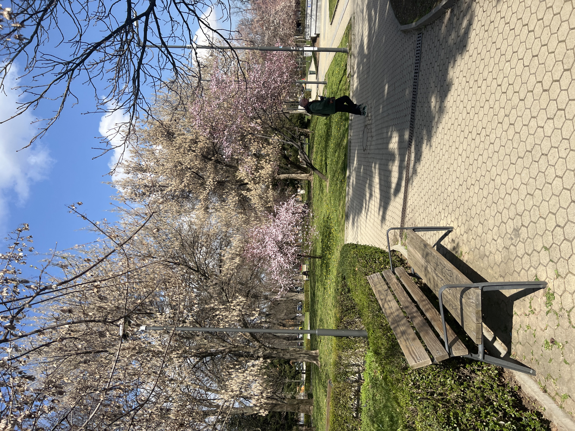 This image depicts a sunny day in Borisova Gradina (Boris's Garden), Sofia, Bulgaria, likely within its Japanese Garden section, during early spring