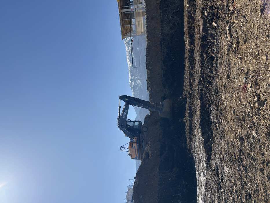 The image displays a construction site located in the southern part of Sofia, Bulgaria, at the foothills of the snow-capped Vitosha Mountain, which is prominently visible in the background under a clear, bright blue sky. A large, orange and dark gray Hyundai tracked excavator is positioned on an elevated mound of excavated earth. Its articulated arm and bucket are extended downward into a deep, freshly dug trench, indicating ongoing excavation. The foreground consists of uneven, disturbed brown soil with visible rocks and areas of dampness, and a small red-tipped marker stake is present in the lower right. To the left background, white scaffolding structures are partially visible, while to the right, a building frame under construction, utilizing wooden formwork, stands behind a low fence line. The scene is brightly illuminated by direct sunlight originating from the upper left. No people are visible.